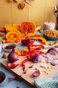 Chopped-onions-peppers-chopping board-butternut squash