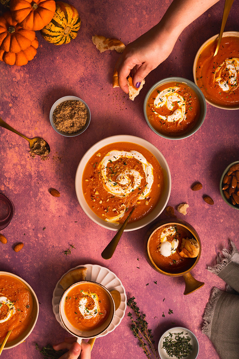 Pumpkin soup with yoghurt drizzle, thyme and dukkha